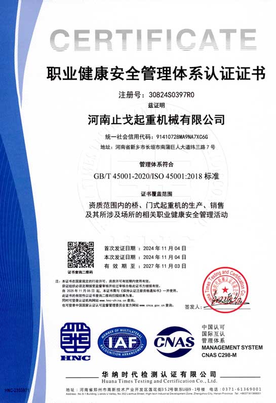 职业健康安全管理体系认证证书