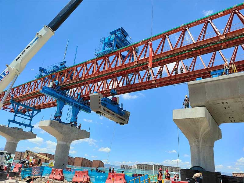 JP700-45节段拼装架桥机用于哥伦比亚波哥大地铁一号线项目。覆盖架设45m及以下跨度,全悬挂能力700t,由主桁架梁、支承结构、起重系统、下放系统、液压系统、电气系统和安全监控系统等七大部分组成。