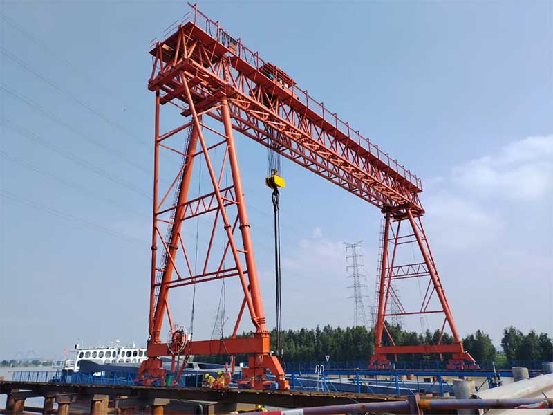门式起重机(又称龙门起重机)是桥架通过两侧支腿支撑在地面轨道上的桥架型起重机。在结构上由门架、大车运行机构、起重小车和电气部分等组成。 双梁桁架门式起重机 使用型钢焊接而成的结构形式,优点是造价低,自重轻,抗风性好,拆装方便。但是由于焊接点多和桁架自身的缺陷,桁架梁也具有挠度大,刚度小,工作级别相对较低。较常用于预制梁场。